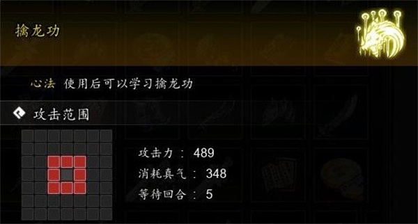擒龙:自身命中+30%,效果期间使用任何丐帮招式有50%几率在1回合内使目标当前集气-15%,移动-2。