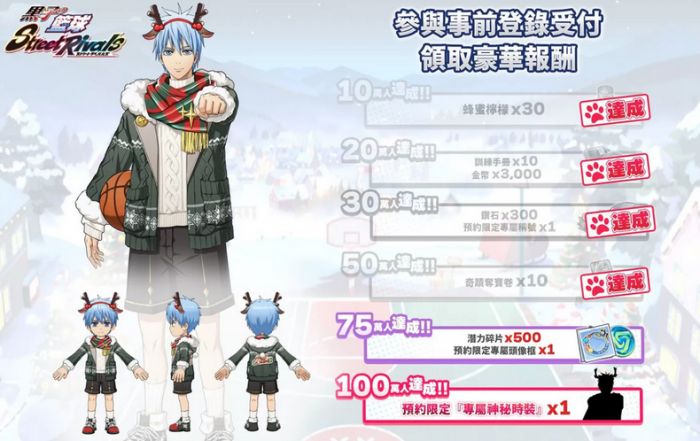 隨著今日事前預約人數正式突破 50 萬,也正式公布先前所預告,只有預約玩家限定擁有的角色時裝,全新原創黑子哲也的「冬日鈴聲」限定時裝。