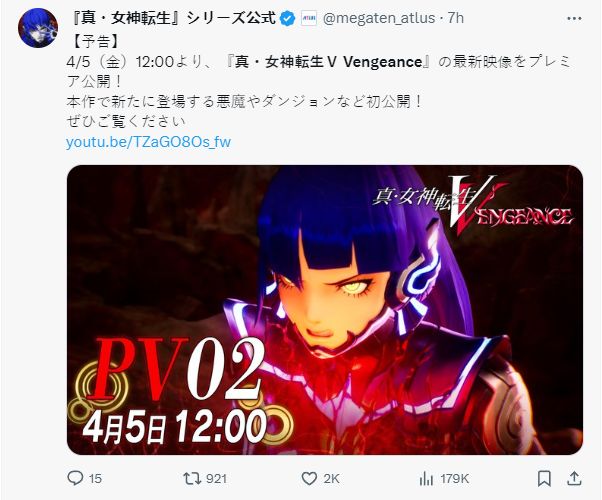 《真女神轉生5:Vengeance》官方表示該作的發售日會比原定的時間早一周,改在6月14日推出,對應PS5、PS4、Switch、Steam、Xbox Series X|S、Xbox One、Windows平台,支持中文。
