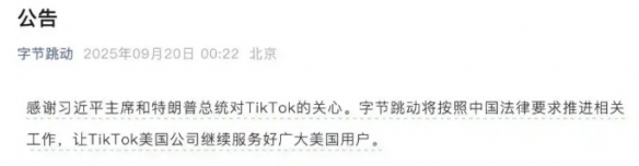 【字節跳動於今日凌晨發布公告,表示將嚴格依照中國法律推進相關工作,確保TikTok美國公司持續為美國用戶提供優質服務。