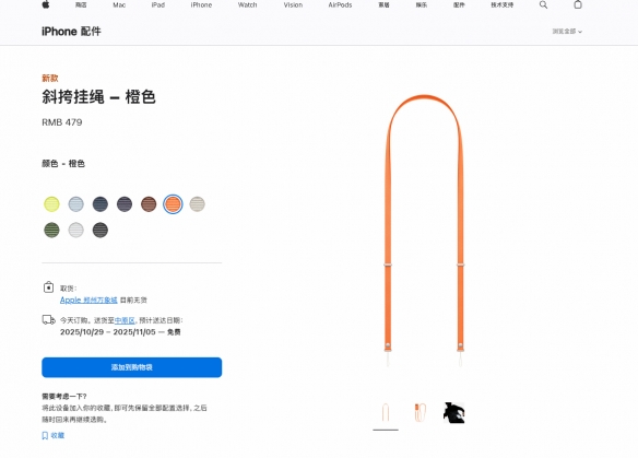 【近日,蘋果為iPhone 17系列推出了斜挎掛繩,提供霓虹黃色、淺藍色、藍色、紫色、赭褐色、橙色、小麥色、綠色、淺灰色和黑色共10種顏色,定價479元。這個高昂的售價曾引發網友熱議。