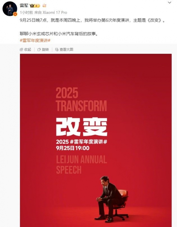 今日上午,小米集團董事長兼CEO雷軍透過社群媒體宣布,將於9月25日(週四)晚間7點舉辦其個人第六次年度演講,主題定為《改變》。屆時,雷軍將分享小米在自研玄戒晶片及小米汽車研發背後的重要歷程與故事。