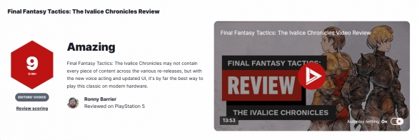 IGN簡評:雖然《最終幻想戰略版:伊瓦利斯編年史》並未包含所有重製版中的全部內容,但憑藉全新的配音和優化後的用戶介面,這無疑是當今硬體上體驗這款經典遊戲的最佳選擇。