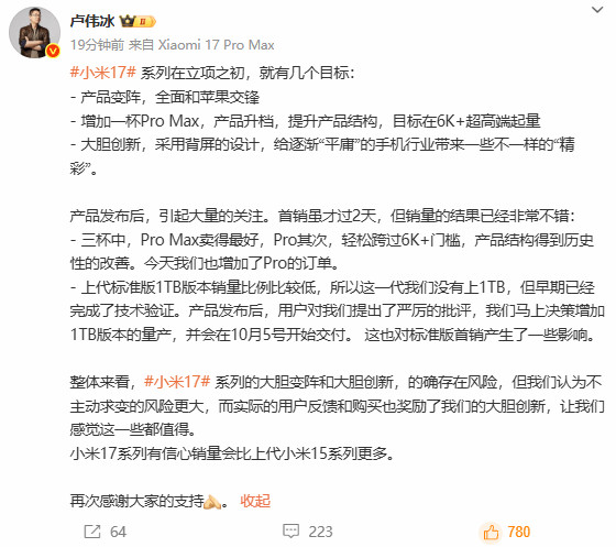 近日,盧偉冰於微博上分享了其新產品自發布以來便受到廣泛關注的消息。即便首銷僅經歷了兩天,銷售表現已十分亮眼:在推出的三款型號中,Pro Max版本最受青睞,而Pro版本緊隨其後,且輕易跨越6000元的價格門檻,顯示出前所未有的產品結構優化趨勢。目前,小米已經增加了對Pro版的生產訂單量。