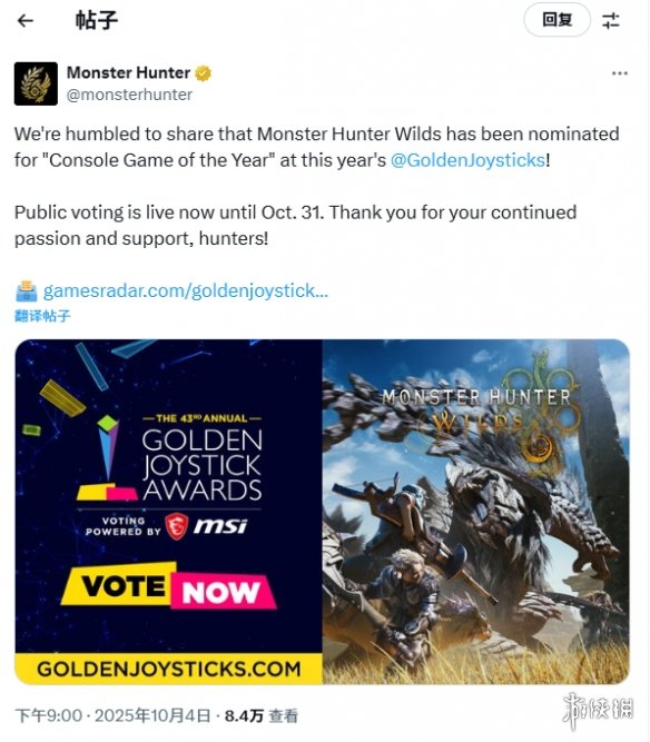 在日前公布的2025金搖桿獎項提名名單中,《怪物獵人:荒野》獲得了最佳主機遊戲的提名。官方也在“X”上發文慶祝,但在評論區卻遭到許多玩家的質疑和嘲諷,認為該遊戲不配獲得此項提名。