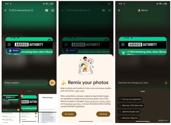 用戶啟用該功能後,在媒體選擇器中將看到新增的「Remix」選項。首次使用時,系統會提示用戶將圖片傳送至谷歌伺服器進行處理,同意後進入編輯介面,可輸入自定義提示詞或選用系統推薦詞。點擊「Banana」按鈕即可啟動AI生成,處理完成後展示結果。若對效果不滿意,可多次進行Remix操作直至滿意,最終點擊「完成」後,新圖片將替換原圖並可直接發送到聊天。