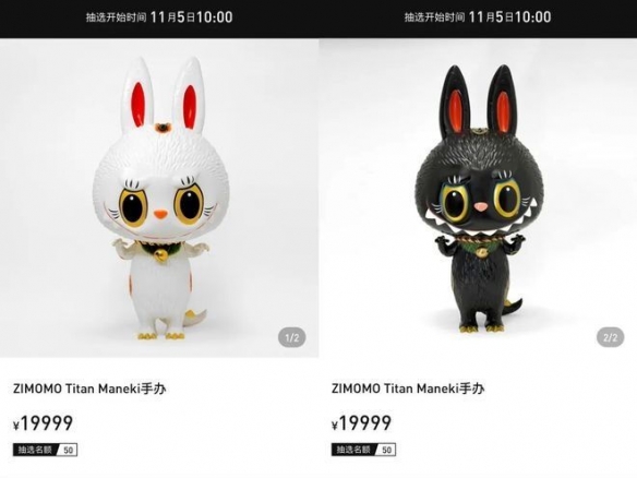 為慶祝Labubu The Monsters系列誕生十週年,泡泡瑪特於11月5日正式推出了ZIMOMO Titan Maneki十週年紀念手辦。該手辦於當天上午10時開始抽選購買資格,全球限量僅50體,官方售價為19,999元。