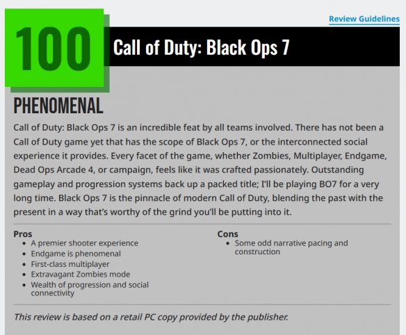 今日,《決勝時刻:黑色行動7(Call of Duty: Black Ops 7)》的媒體評分正式解禁,外國遊戲網站Gamingtrend為其打出了滿分的成績,稱讚這款作品是現代最出色的《決勝時刻》遊戲。