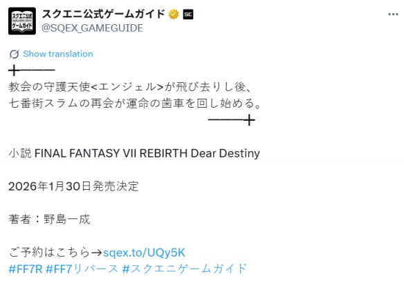 今日,Square Enix宣佈將於2026年1月30日在日本發售《最終幻想7:重生》的官方小說《Dear Destiny Launches》,定價為1760日圓(約80元人民幣)。