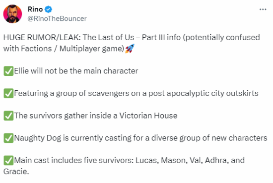 近期,關於《最後生還者3》的消息又逐漸多了起來。今日,知名新聞博主Rino將之前和近期關於《最後生還者3》的消息進行了彙總,一起來看下吧,其中部分消息可能與《最後生還者》多人遊戲相關。