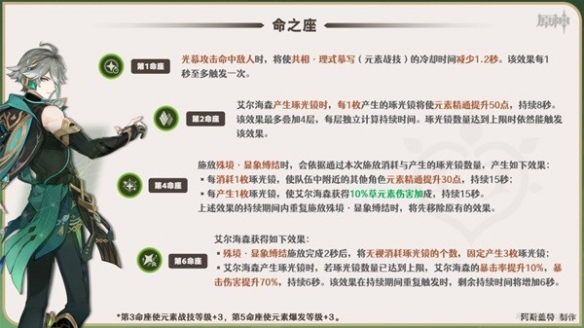 ①.解鎖1命後,艾爾海森的琢光鏡攻擊命中敵人後將減少戰技CD,當在搭配部分軸較短的角色時可以減少輸出空檔,優化隊伍的整體輸出手法。
