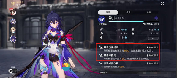 我方全體角色能量恢複效率提高50%,並且我方角色每次施放大招後,全體恢複10點能量,暴擊率提升5%,暴擊傷害提升15%,持續2回合,最高疊加10層。主打就是一個快速充能加大招疊BUFF 。